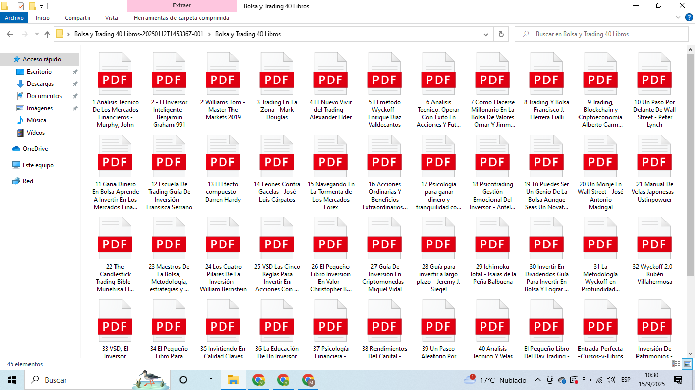 +40 recursos formativos en PDF orientados a inversión y trading (libros/guías). Enfoque en análisis técnico, estrategias y visión de largo plazo.